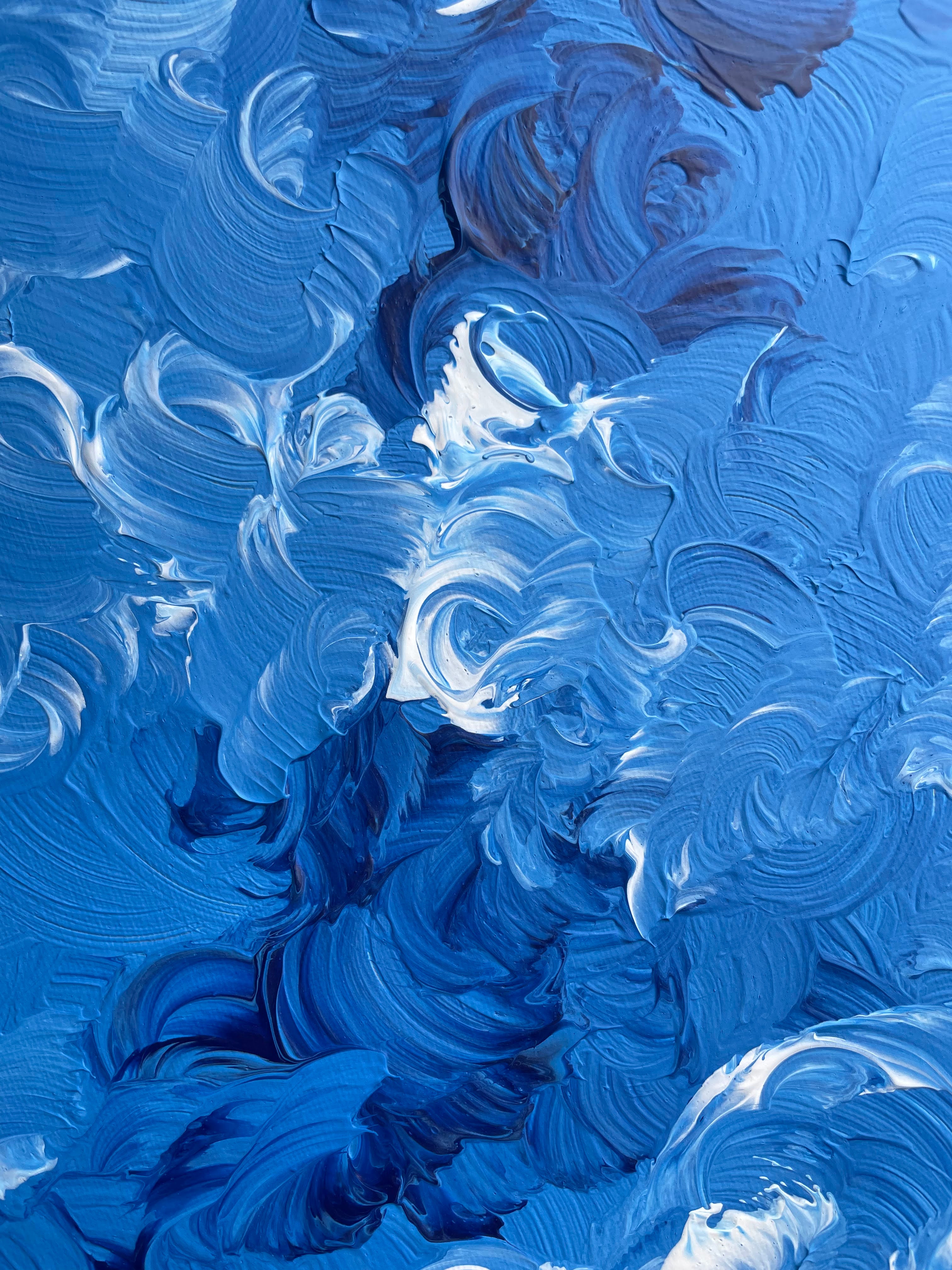 A swirl of deep and light blues dances across the canvas, evoking the ebb and flow of emotion and motion. Each textured stroke feels like a wave that is shifting, colliding and merging into calm. Capturing the fluid rhythm of thought and memory suspended in stillness.