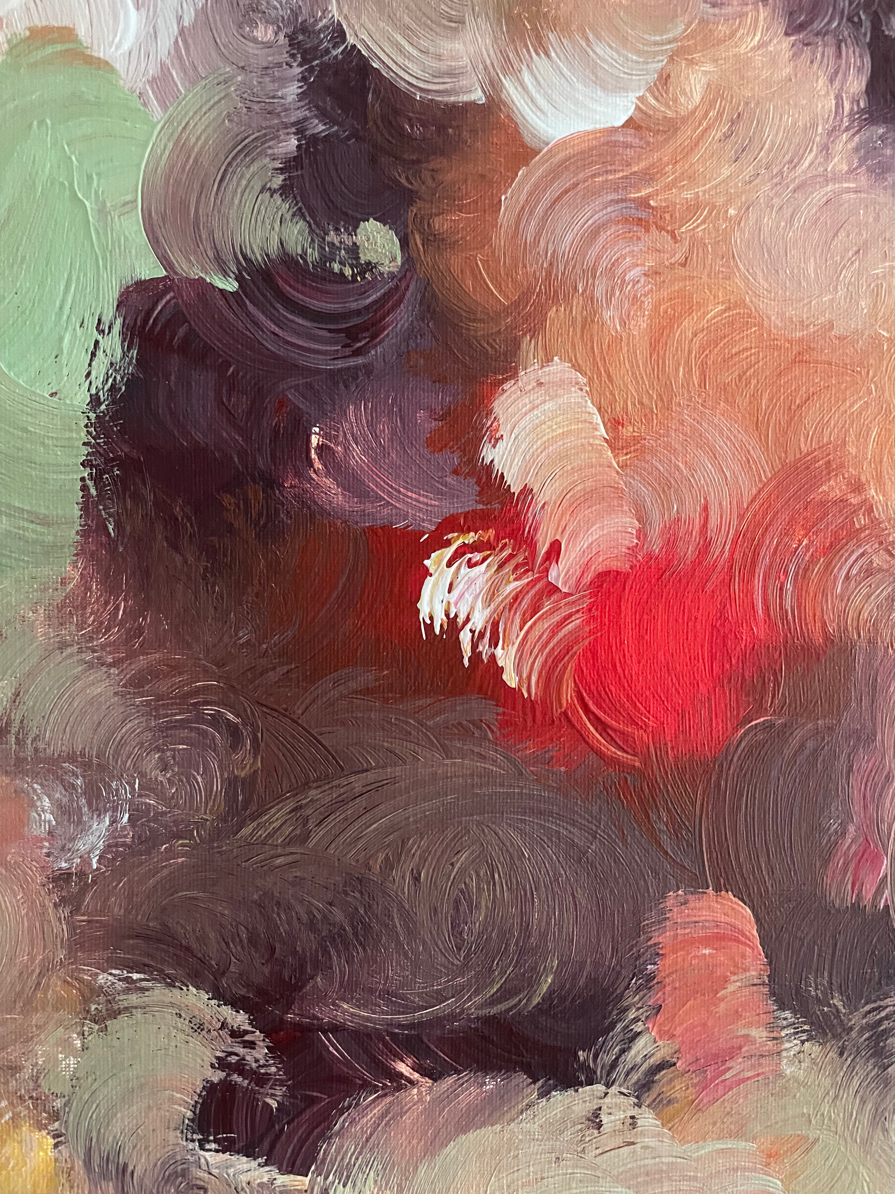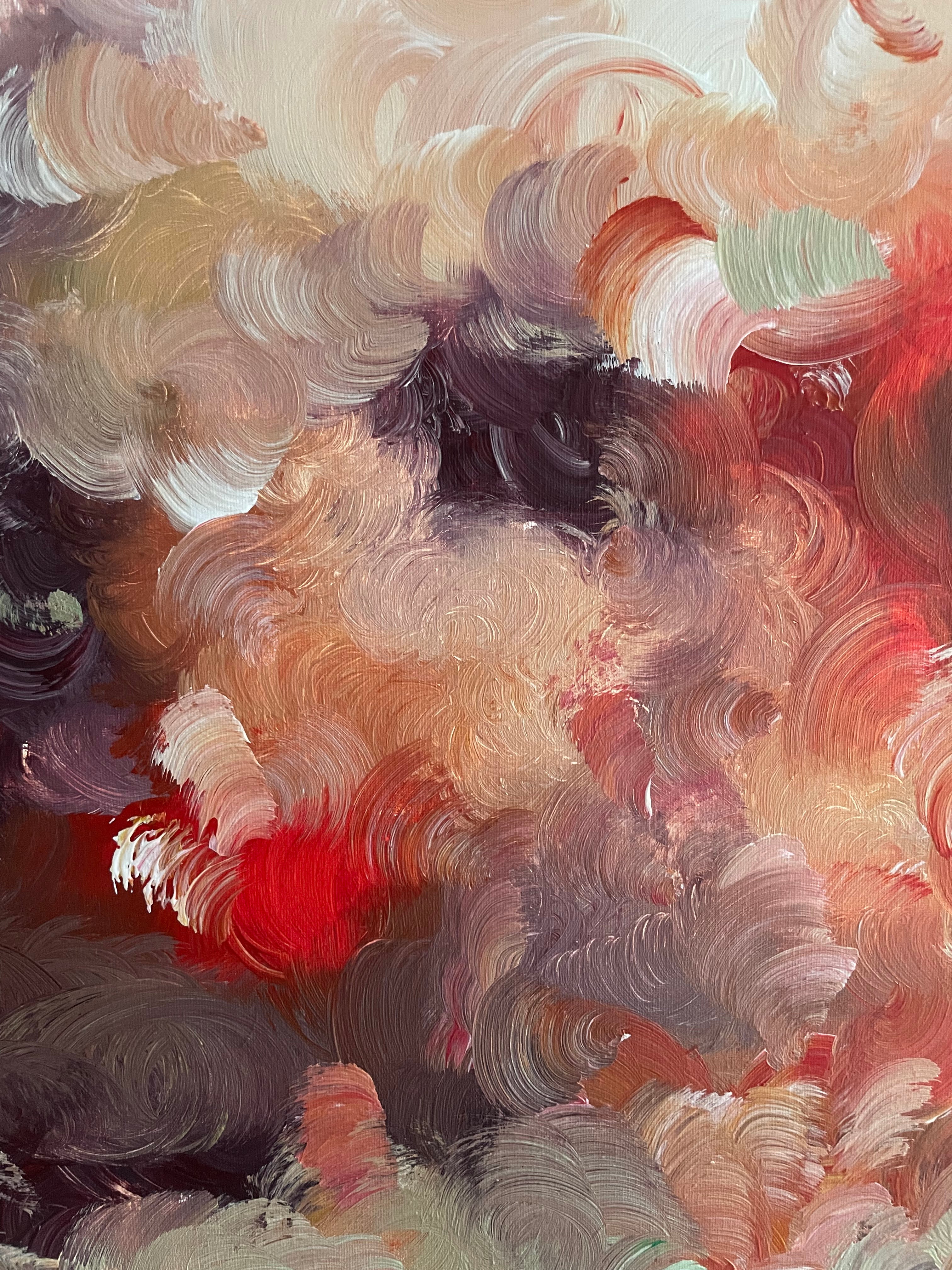 This canvas is bursting with earthy tones that spiral and fuse with bursts of crimson and ivory. It is a quiet collision of warmth and depth, where movement meets stillness in a slow burn