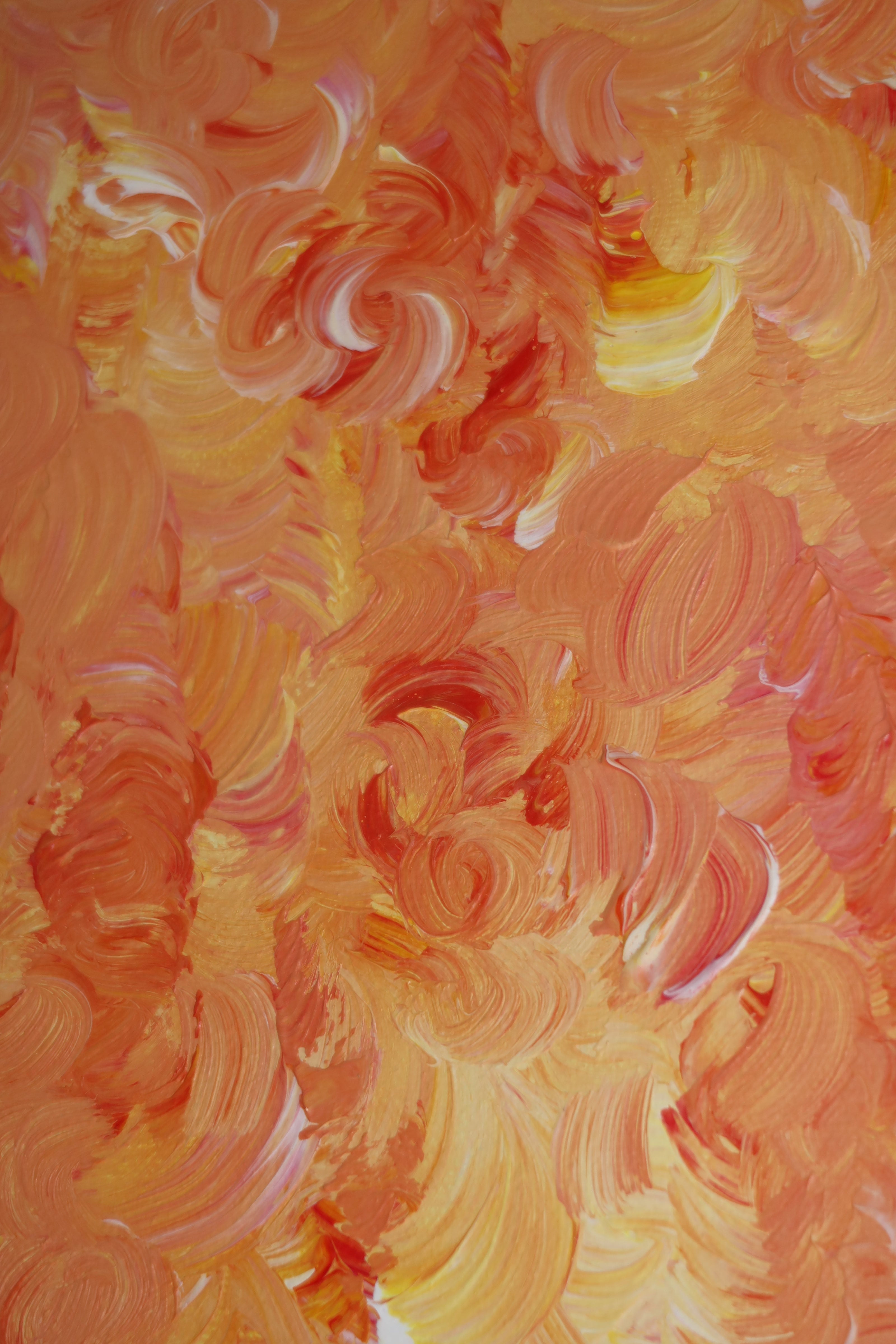 Warm strokes of orange, white and red blend in motion. This canvas is a dance of heat and light and pulse of energy.